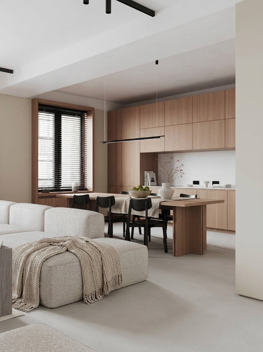 Minimalist modern open-plan living room and kitchen, neutral tones, light wood cabinets, beige sofa with knitted throw