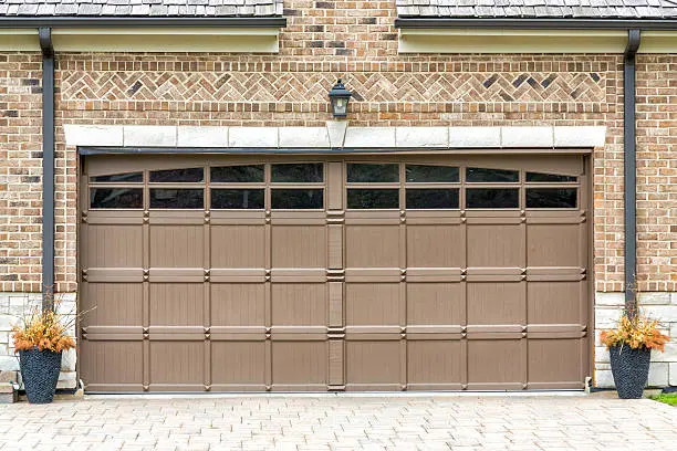 Brown sectional garage door with windows on a brick house, surrounded by decorative planters on a paved driveway.