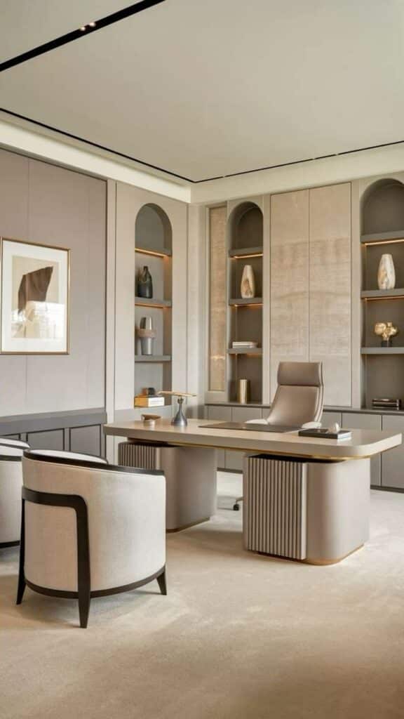 How your office looks affects how people feel. A modern, clean design can make a big difference. Use neutral colors with small pops of bright tones to keep things calm and professional.