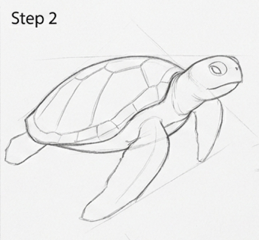 ✏ Pro tip: The most common proportion mistake at this stage: the head is drawn too large. A turtle’s head is small relative to its body — much smaller than feels natural when you’re drawing it. If the head oval looks ‘right’ to your eye, it’s probably too big. Try making it noticeably smaller than feels comfortable. Photograph your construction sketch and compare it to a reference photo — this will reveal proportion errors immediately that are invisible when looking at the drawing straight-on.