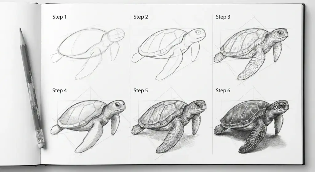 Once I understood the structure, the drawing became a construction problem rather than a copying problem. This guide covers that structure in detail — the scute anatomy you need to know before touching the paper, a six-step construction process that produces convincing results from the first attempt, three species variations (sea turtle, box turtle, and tortoise) with their specific drawing differences, the common mistakes and their fixes, and the shading approach that makes a shell look three-dimensional rather than flat. Everything here is what I wish the original tutorials had told me.