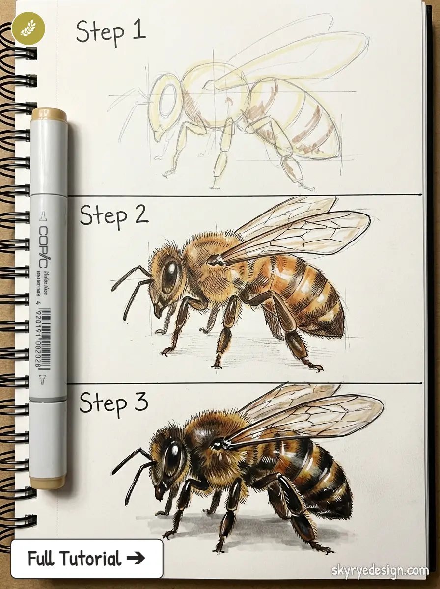 A clean, recognizable bee drawing is achievable in your first session. A convincing realistic bee — with accurate proportions, texture, and detailed wings — typically takes 3–5 practice drawings spread over a few days. The bottleneck is usually wings and stripe curvature; once those click, everything else comes quickly.