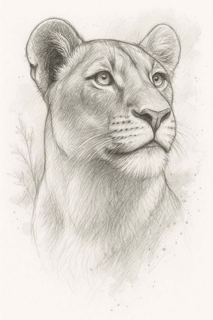 Pencil sketch of a lioness looking upward, detailed with light shading and botanical elements in the background.
