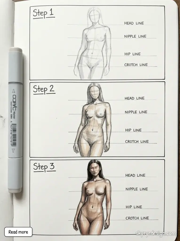 Sketch of a female figure drawing with labeled proportion guide, highlighting lines for head, nipple, hip, and crotch for artistic reference.