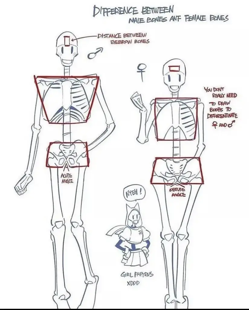 Diagram illustrating skeletal differences and shape language for artists, comparing male and female proportions, with simplified guides.