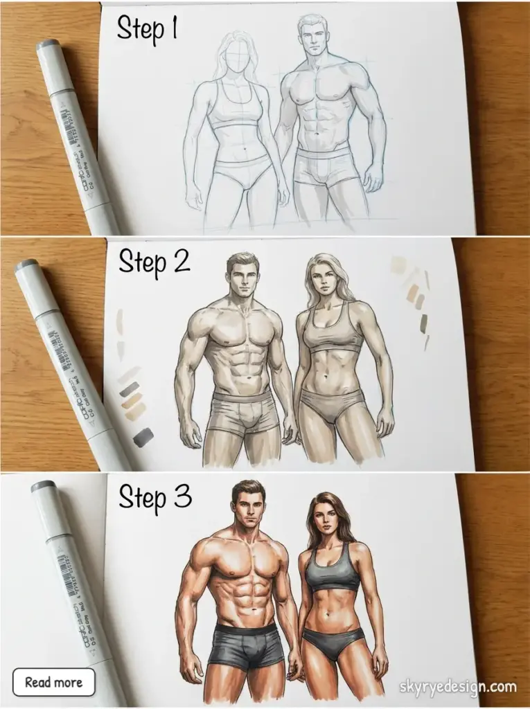 Sketch progression of a fit man and woman in three steps, from basic outline to detailed shading, with a pencil beside the drawings.