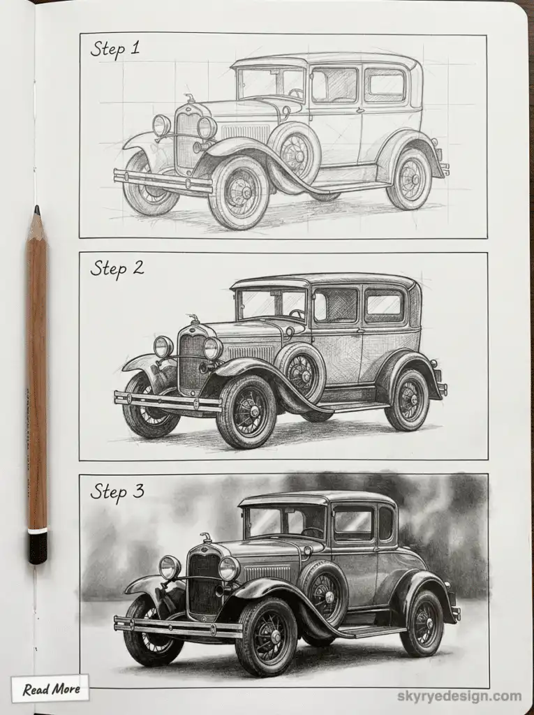 Creating vintage car drawings involves using specific tools and styles that bring out the unique shapes and details of classic vehicles. Artists focus on materials that allow for fine lines and shading. They also choose styles that capture the elegance and character of older cars.