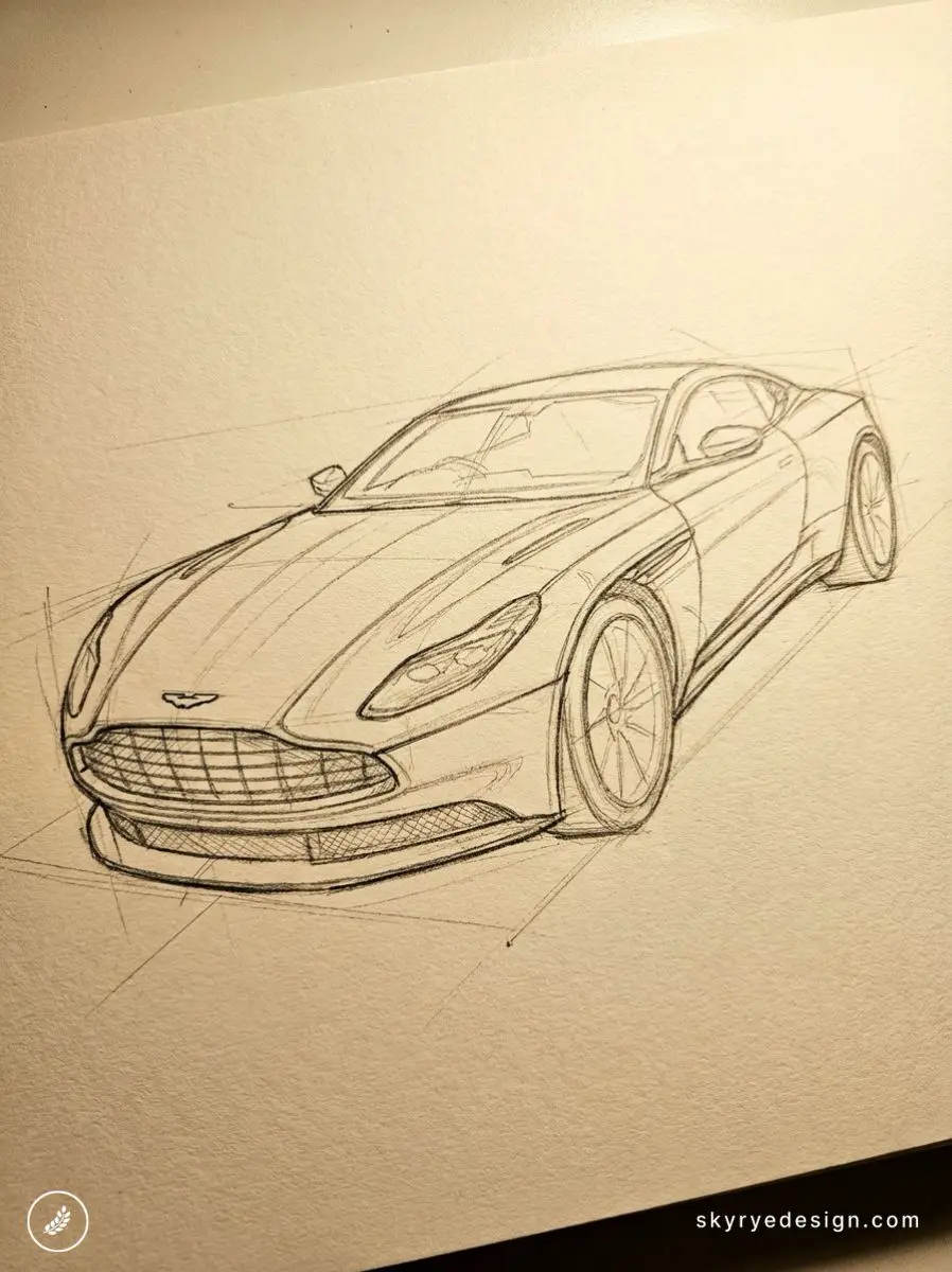 In your construction sketch, establish the bonnet length before anything else. Draw a horizontal centre line for the car’s full length, then mark the 40% point — that’s where the windscreen base sits. Everything forward of that line is bonnet; everything rearward is cabin and tail. If the cabin occupies more than 60% of the car, the drawing will never read as an Aston Martin regardless of how well you render the details.
