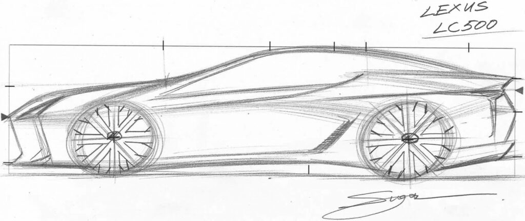 Start with the side profile and nail the rear haunch before anything else. That bulge determines the car’s entire character. I’ve seen countless LC 500 sketches fail because the rear haunch was too subtle — without that mass, the car just looks like a big coupe rather than a rolling piece of sculpture.