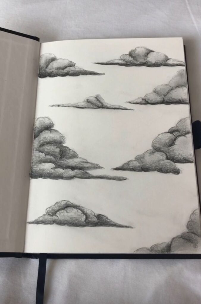 Sketchbook page with detailed pencil drawings of various cloud formations on a blank background.