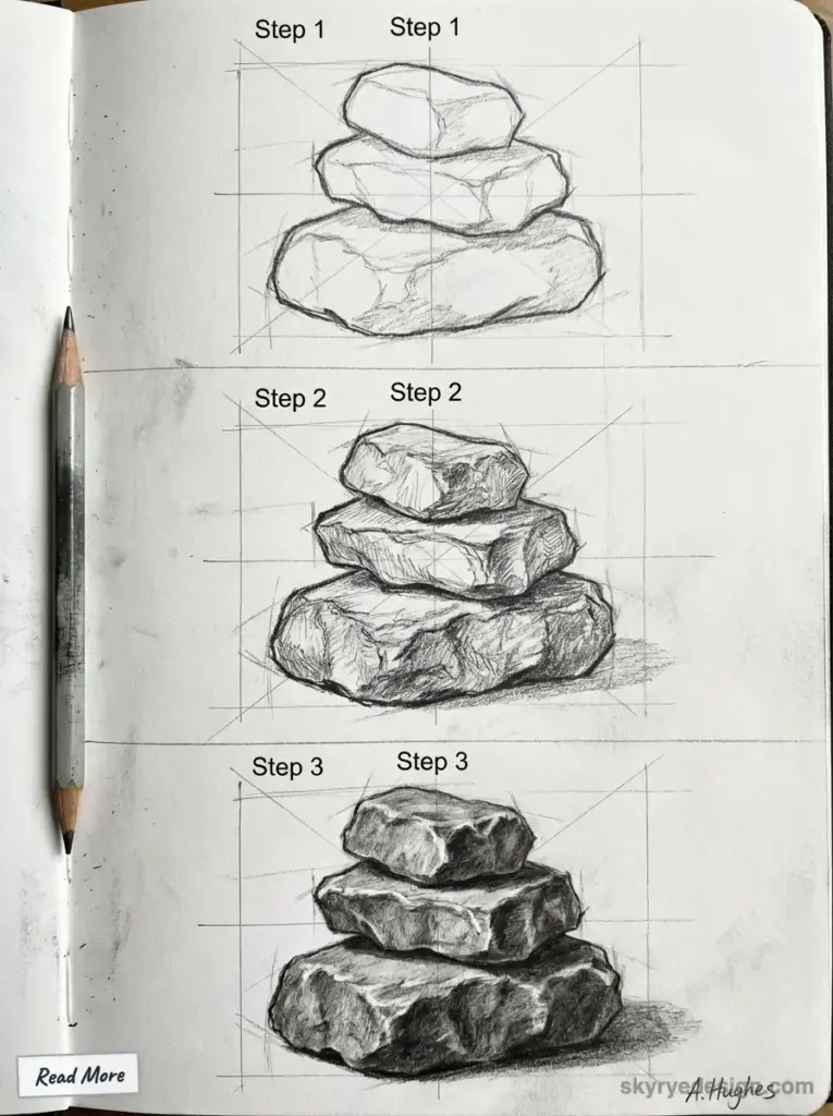 - Neglecting Accurate Light and Shadow: Without a consistent light source and proper value rendering, your rocks will look flat and weightless. Make sure your shadows are consistent.