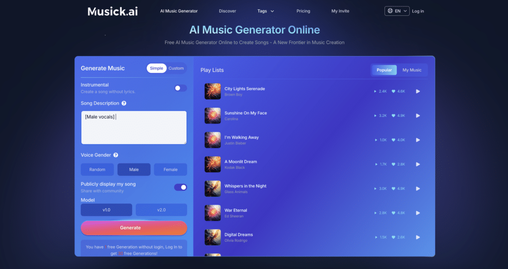 To get the best results, it is important to utilize the available settings. One can choose the voice gender—Random, Male, or Female—and select between different model versions like v1.0 or v2.0 to find the specific “soul” of the track. If a client needs a backing track for their own vocals, the “Instrumental” option is a vital tool to ensure the music doesn’t clash with the lyrics.