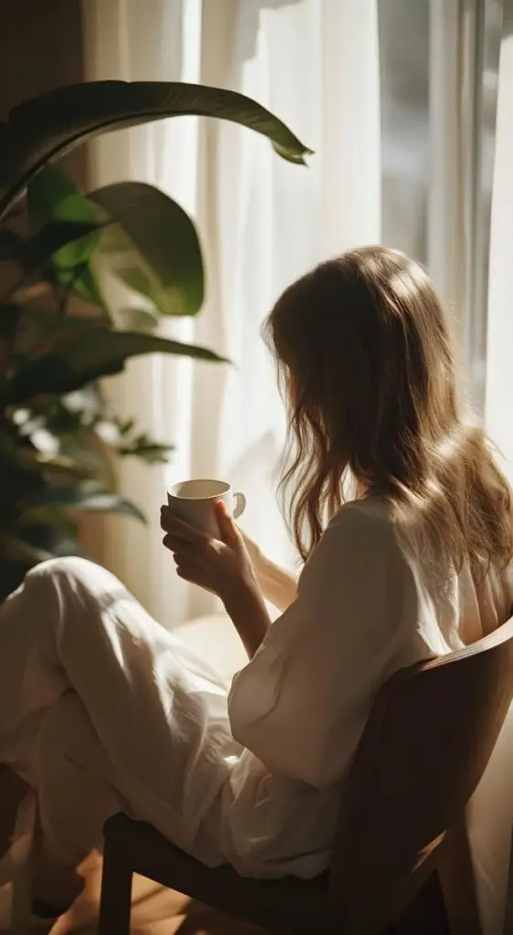 Woman enjoying a peaceful morning coffee by the window, surrounded by soft light and greenery.