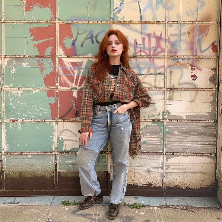 For a men’s-inspired look: Layer an oversized plaid flannel over a 90s band t-shirt (Nirvana’s smiley face works, but less obvious choices like Sonic Youth or Mudhoney feel more authentic). Add loose, faded jeans with natural wear at the knees, black Doc Martens or combat boots, and throw an old army jacket on top when it’s cold. Leave everything slightly untucked and rumpled.