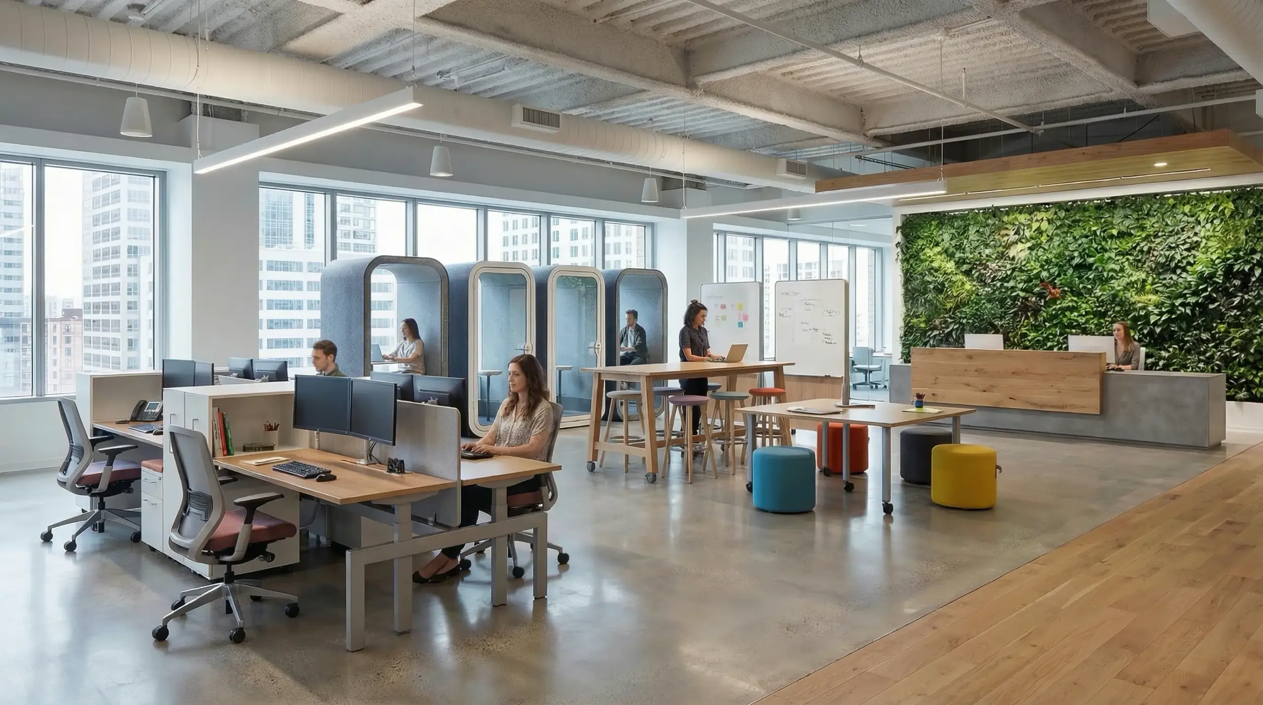 Hybrid working requires spatial variety compelling enough to justify the commute. Modular systems create that variety — focus zones, collaboration hubs, social spaces, acoustic pods — within a standard commercial floor plate. The modular design means those proportions adjust as hybrid patterns change across departments and seasons without any structural intervention.