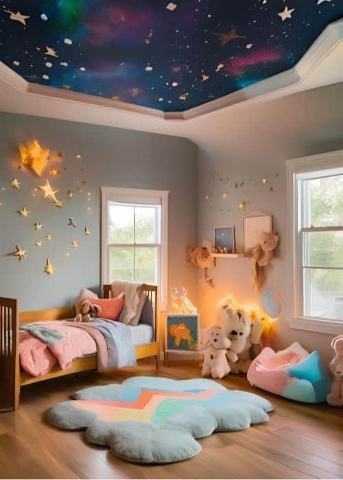 Themes can make a child’s room special and help organize the space. For example, a space-themed room might include star-shaped shelves and rocket decals on the walls.
