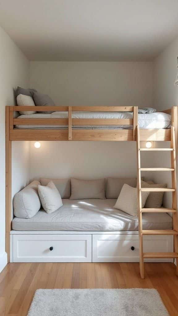 Bunk beds or loft beds save floor space. Create zones for sleeping, studying, and playing using rugs or different colored walls.