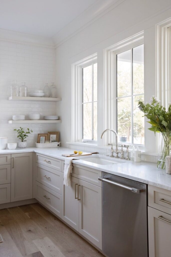 A neutral color palette is central, but you can introduce contrast through matte black fixtures, stainless steel appliances, or subtle wood accents. Floating shelves and under-cabinet lighting keep the space bright and open, making the most of natural and artificial light.
