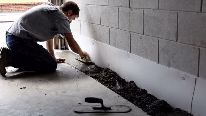 Worker installing a waterproofing system in a basement, ensuring effective moisture control and protection for the foundation.
