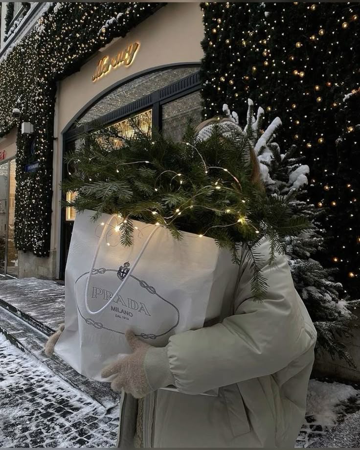Cozy holiday setting with decorated trees, lights, and a person relaxing on a bed, embracing the festive ambiance.
