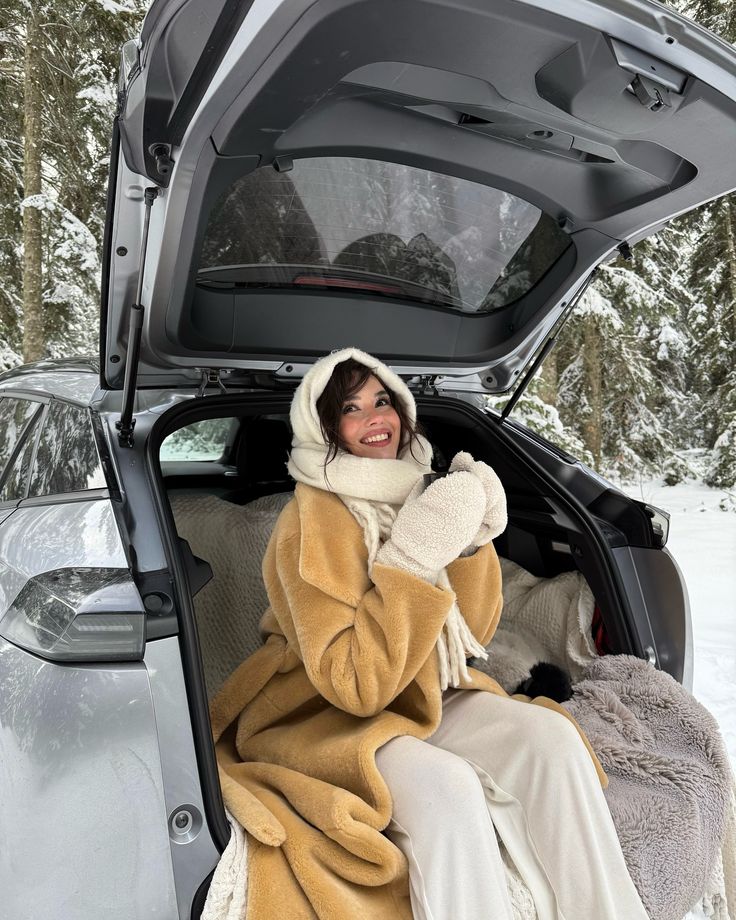 Fashionable woman in winter attire posing in snowy mountains with luxury car.