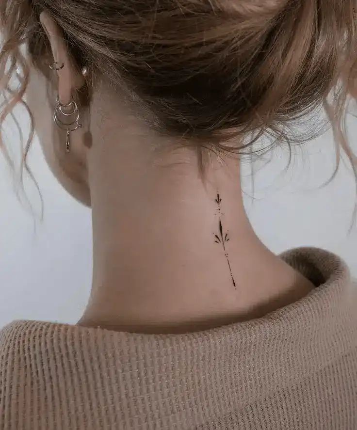 Minimalist neck tattoo design with delicate black lines, styled on a woman with light brown hair wearing a beige sweater.