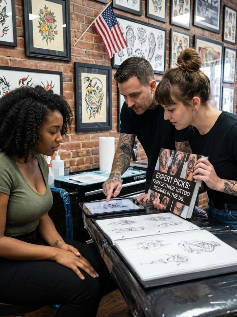 Experience with thigh placements is crucial. Women should review portfolios for clean linework, consistent shading and healed results. A consultation allows discussion of style, size, placement and pricing before booking.