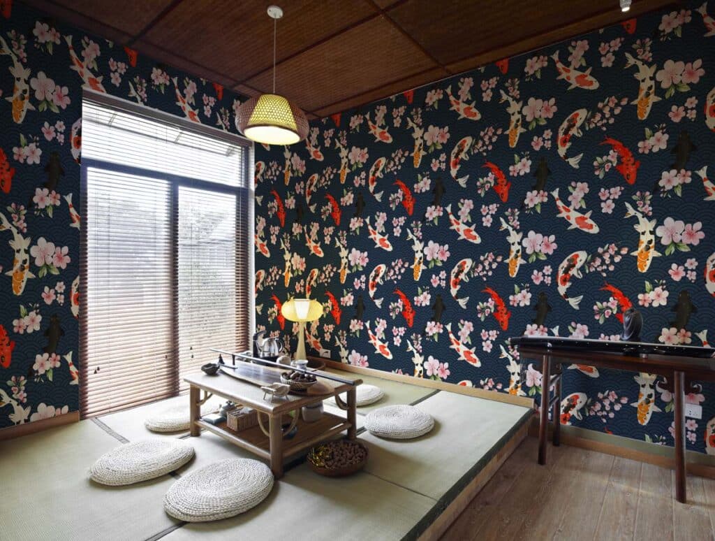 Japanese-style room with koi fish and cherry blossom wallpaper, tatami mats, low wooden table, cushions, and a serene ambiance.