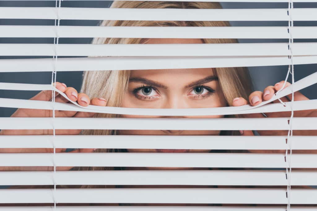 Woman peeking through white blinds with curious eyes, capturing a sense of intrigue and mystery.