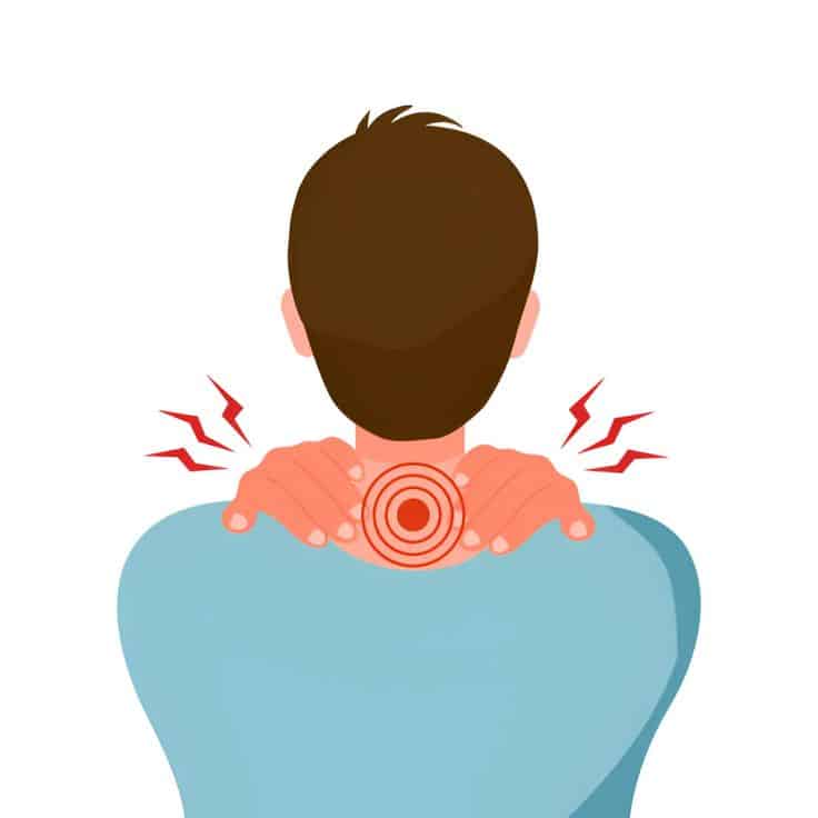 Illustration of a person with back pain, holding their neck and shoulders, symbolizing discomfort and stress relief concepts.