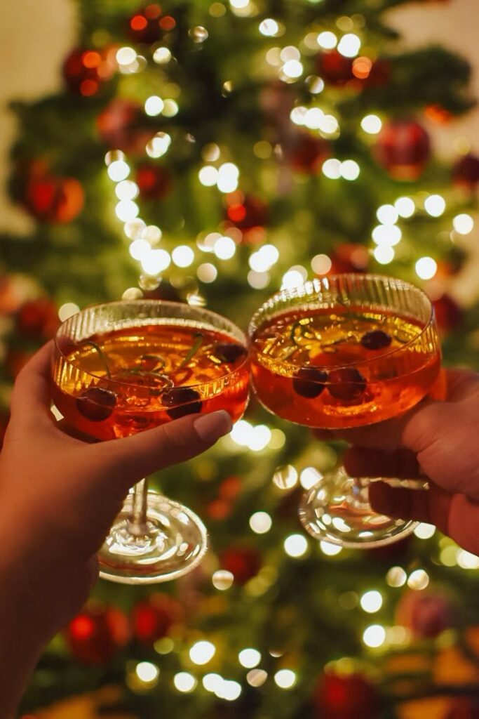 Festive cheers with cocktails in front of a beautifully lit Christmas tree, celebrating the holiday season in style.